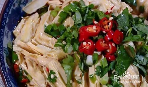 将做好的酱汁淋在腐竹上,再放些葱花、辣椒、香菜点缀一下,凉拌腐竹就做好了。