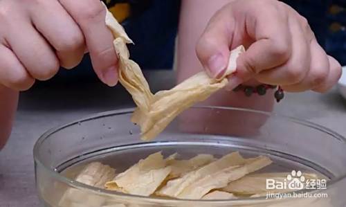 泡发腐竹,需要盐和盘子,盘子要选有一点深度的。