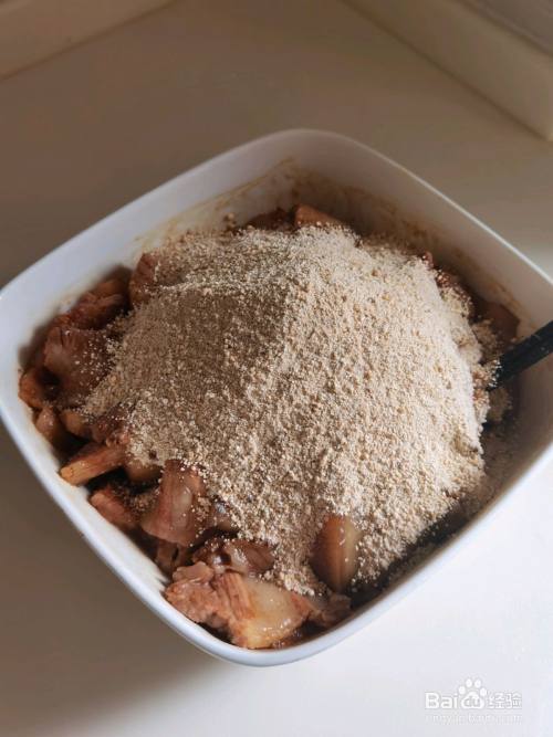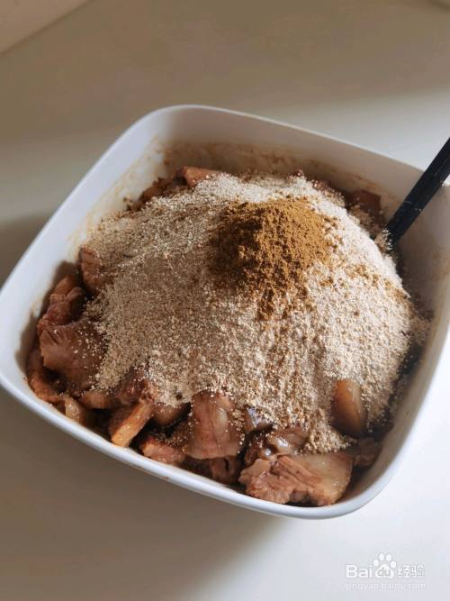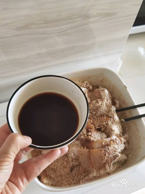 酱油、白糖兑水,撒入拌好米粉的肉片中,拌匀