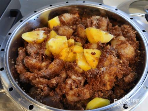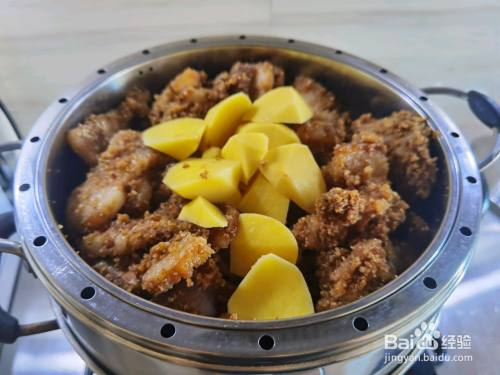 在撒一次酱油白糖水,放入切成块的土豆。继续蒸