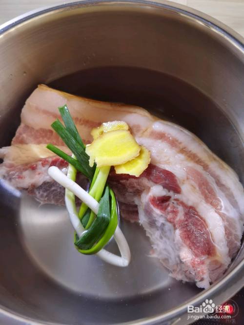 五花肉放入凉水中,加葱、姜和料酒煮开,盖锅盖焖十分钟