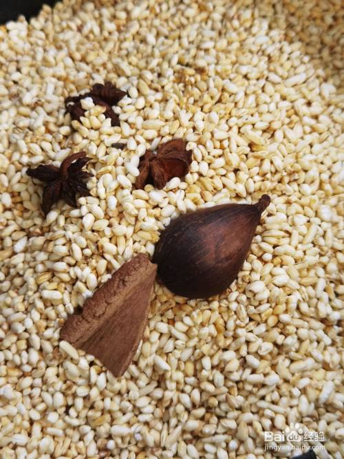大米、草果、八角、丁香和桂皮炒香、炒黄至米粒微微炸裂
