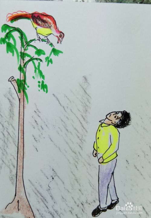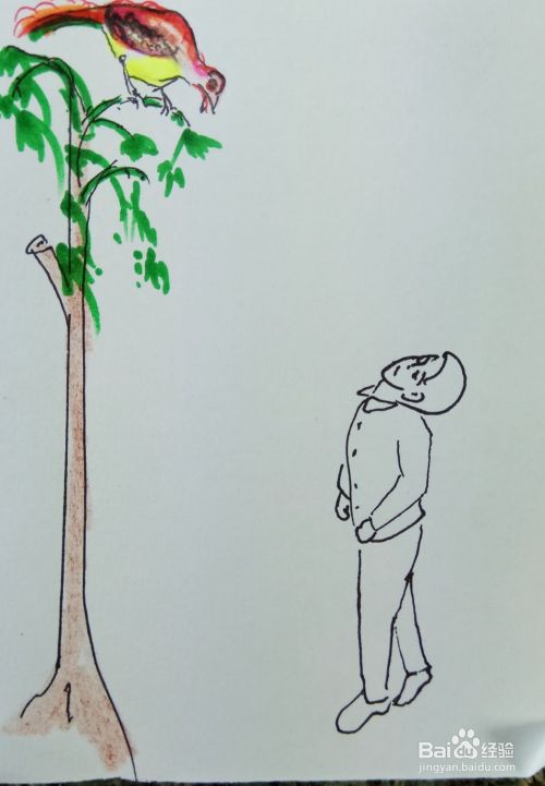 然后再用线条和曲线画出一棵大树,大树上站着一只小鸟,用水彩笔涂出小鸟的色泽,尽量涂出立体感。