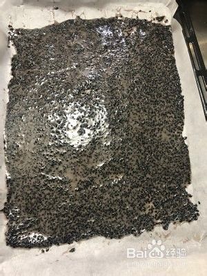 抬起烤盘左右晃动让芝麻糊缓慢往下流动,直到整个烤盘铺满。用刮刀抹匀面糊。