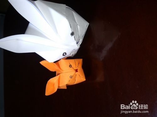 然后把折好的,对着前面的口吹一口气,兔子就鼓起来了,画眼睛和胡须,这样小兔子就折好了。