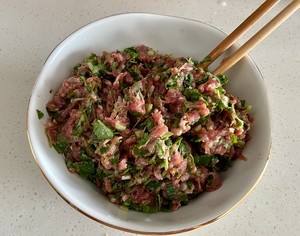 拌馅:将小葱、香菜切碎切碎放入调制好的羊肉中,然后加入适量的料酒、酱油、生抽、盐、十三香等,拌好就可以开始包了。