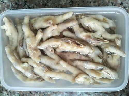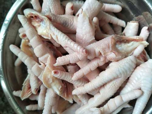1鸡爪清洗干净,剪去鸡脚趾,鸡爪对半切,全部切好后清水多洗几遍备用
