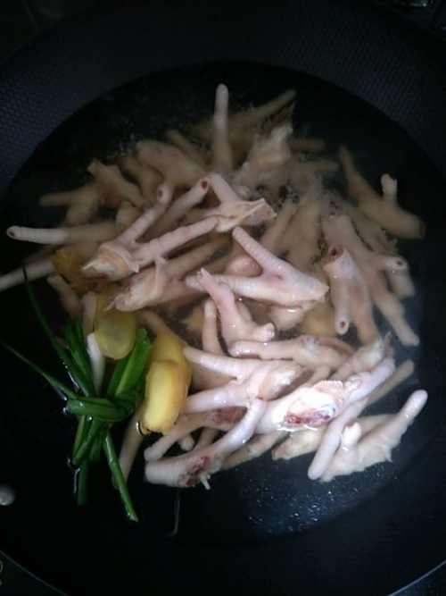 2锅中烧水,水烧开后倒入鸡爪,放料酒、葱、姜片、八角煮八分钟