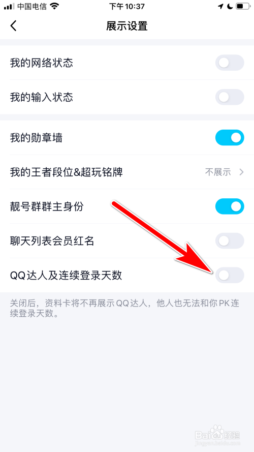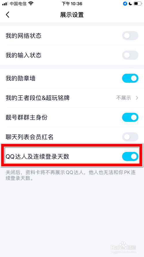 把按钮关掉,即可设置不再展示QQ达人及连续登录天数。