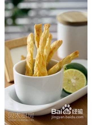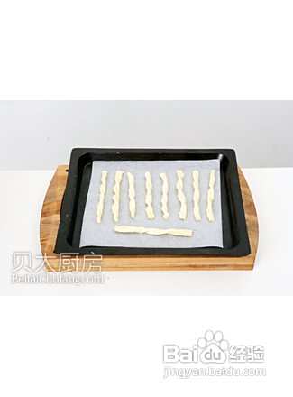 将冷藏后的面片切割成长18cm、宽1cm的长条状,拿起一小条,两头反方向拧几下,放入垫有烘焙油纸的烤盘上。