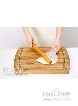 取出冷冻好的奶酪,用擀面杖敲成奶酪碎。