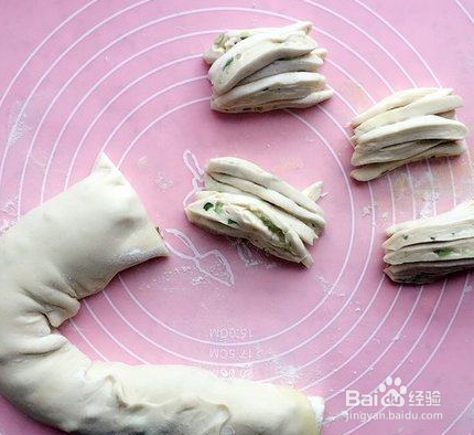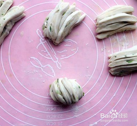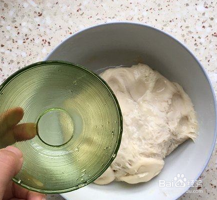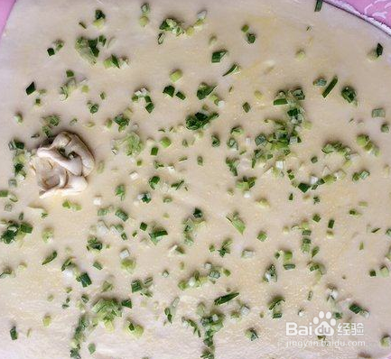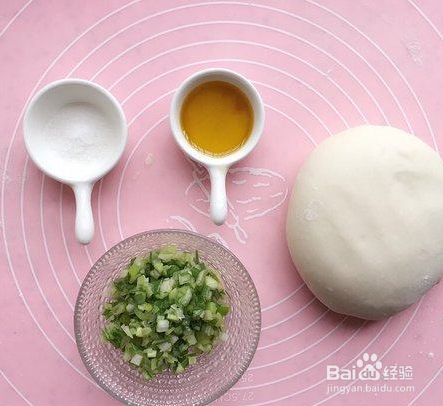 揉好的老面用擀面杖擀薄或是手摊开也可以;撒入盐、色拉油;