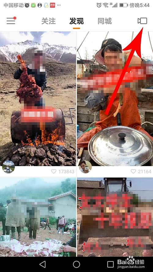 想要制作快闪视频/影集时打开快手APP首页,然后点击右上角的“录制”图标