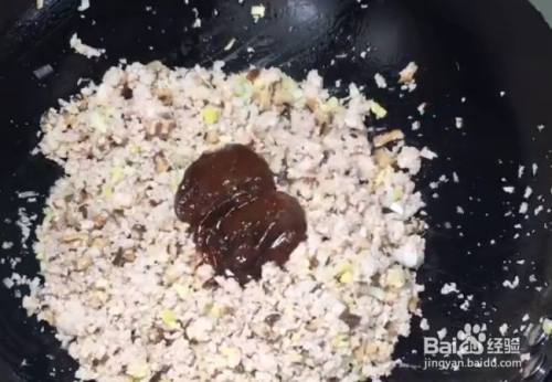 锅中加油炒肉末至变白,加入香菇丁,葱姜蒜末翻炒均匀。