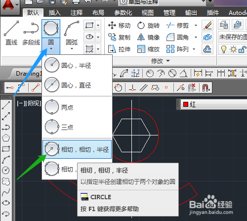 7. 选圆的相切相切半径画出两个圆,修剪线段。标注尺寸。
