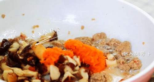 7热锅倒油,放入牛肉末,迅速的划散,炒到牛肉的颜色变白,倒入香菇、胡萝卜。