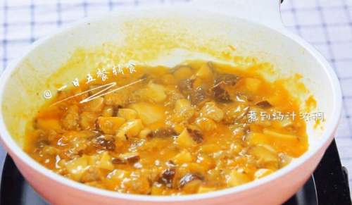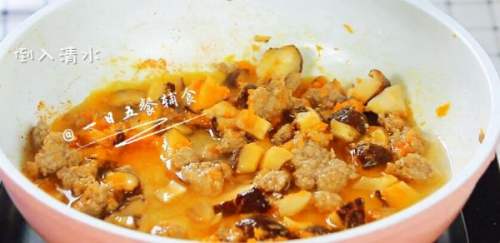 8再炒2分钟,倒入半碗清水,开大火煮沸。