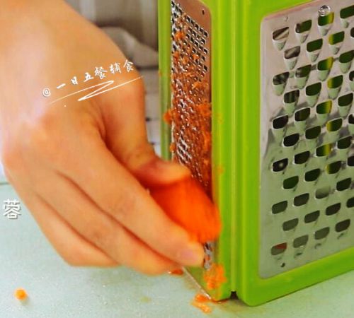 6胡萝卜擦成蓉。由于胡萝卜比较难熟,泥蓉状融到汤里更有利于吸收。