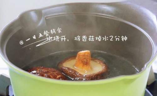 5用刚刚煮面的水将香菇煮2分钟,焯好的香菇切碎。