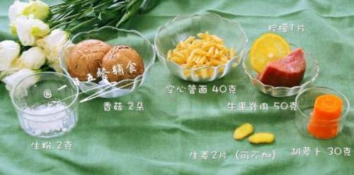 1食材:香菇 2朵,牛里脊肉 50克,空心管面 40克,胡萝卜 30克,柠檬汁 几滴,生粉 2克