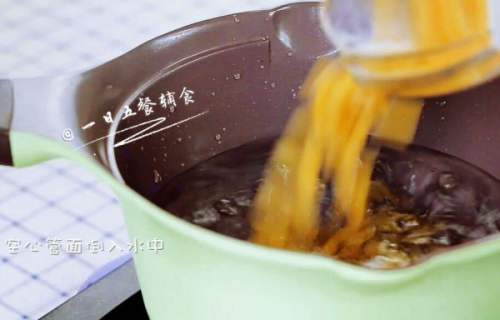 3空心管面倒入水中,将面煮熟,捞出来沥干水备用。
