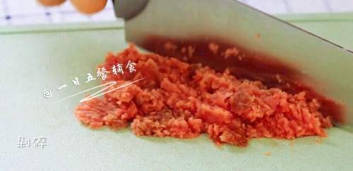 2牛里脊肉洗干净之后切丁,剁碎。好久不用刀剁肉,好佩服平常剁肉的妈妈们。剁好的肉挤几滴柠檬汁腌制。