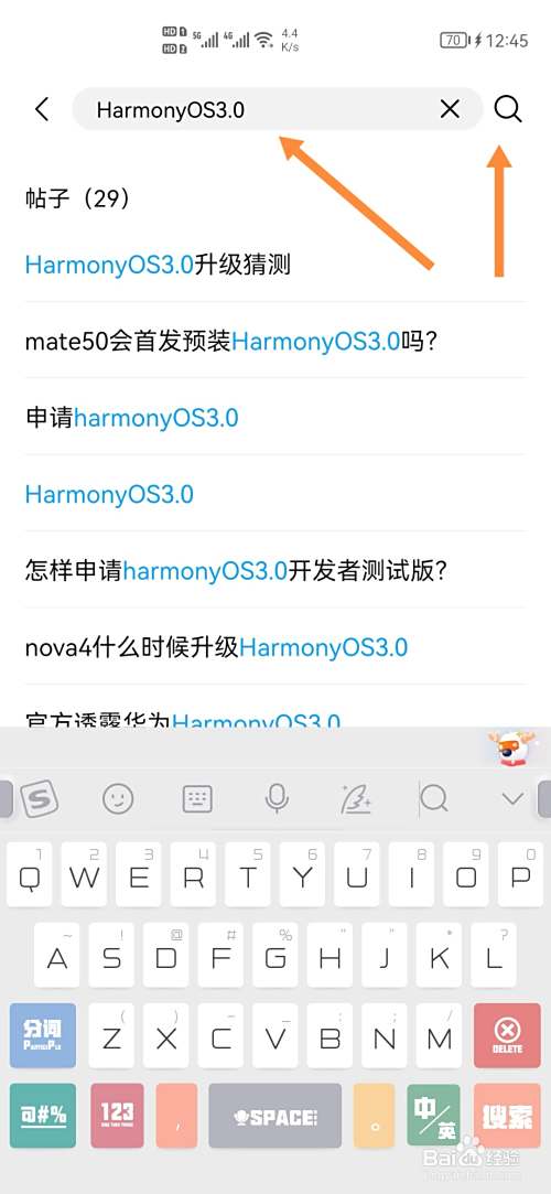 在花粉俱乐部中点击上方的搜索框输入“HarmonyOS3.0”,然后点击搜索。
