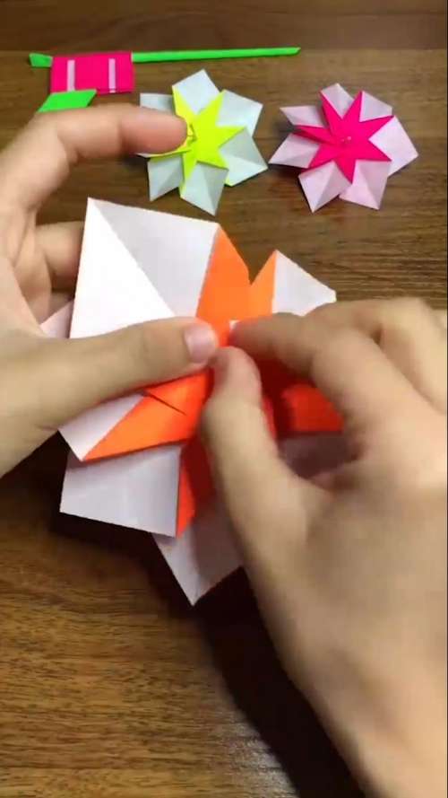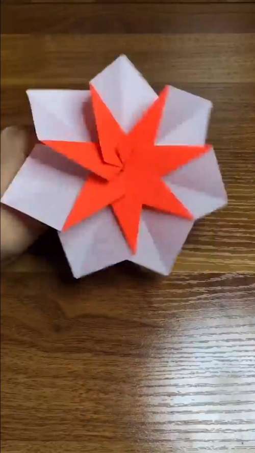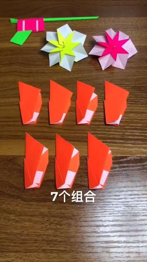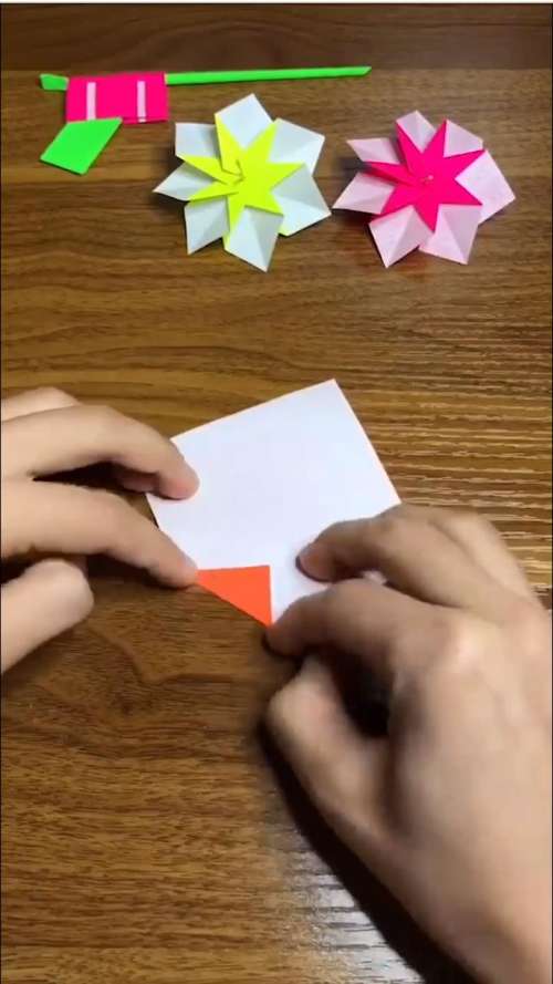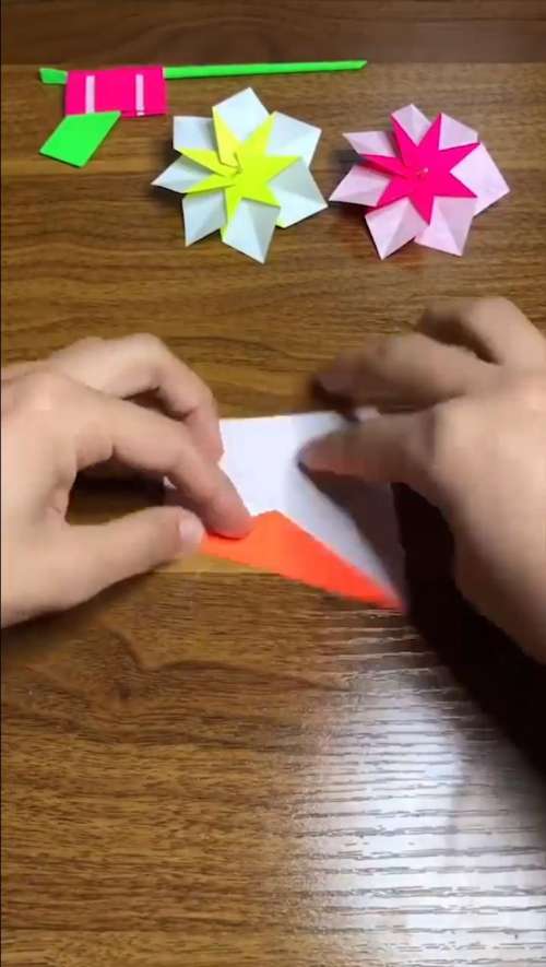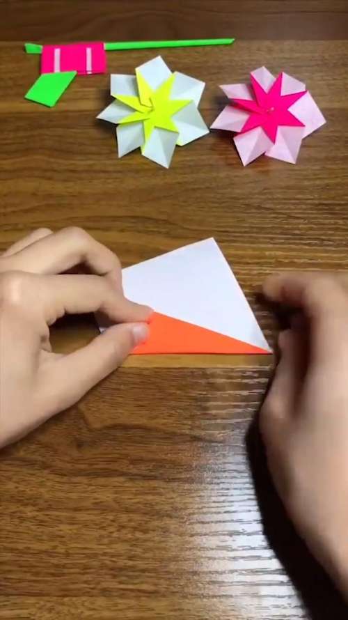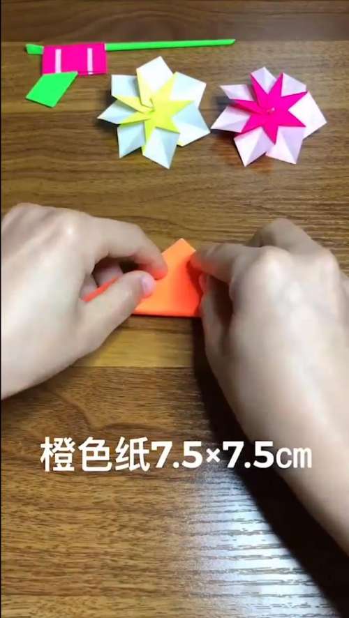 1准备一张橙色正方形纸,7.5x7.5厘米,沿对角线对折。
