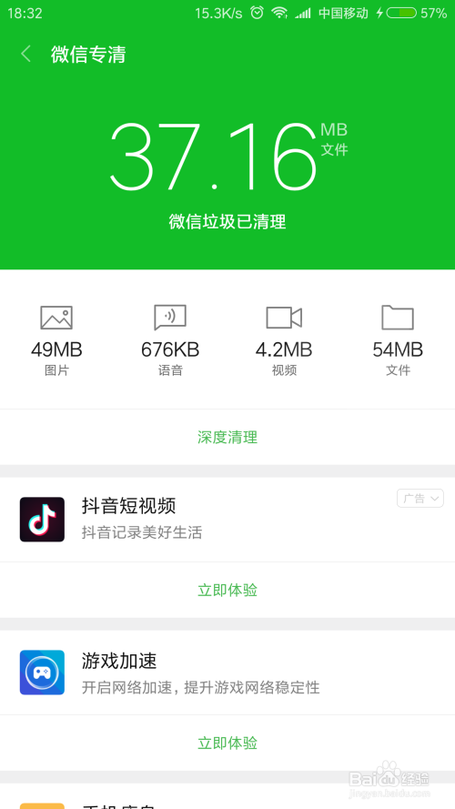 同样的点击微信专清,进去之后就会清理微信中的垃圾,但这还不够彻底。