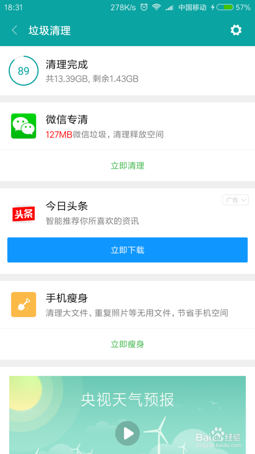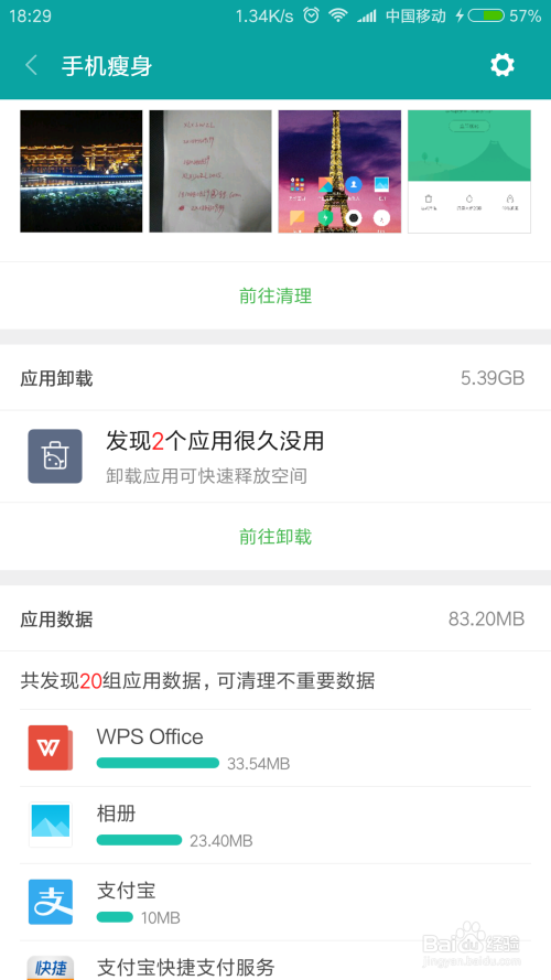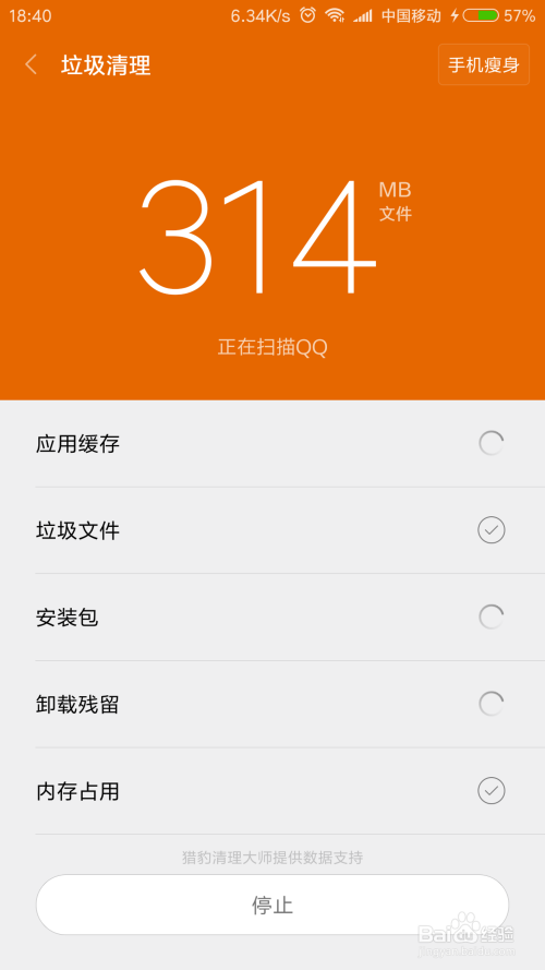 让其继续运行,可清理一少部分垃圾,点击“手机瘦身”。