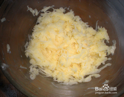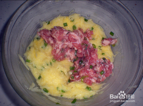 土豆细沫中加入鸡蛋,并搅拌均匀,再加入肉沫搅拌均匀