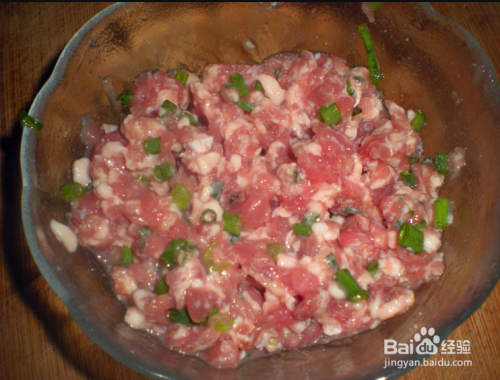 将肉剁成肉沫,并拌上葱花,