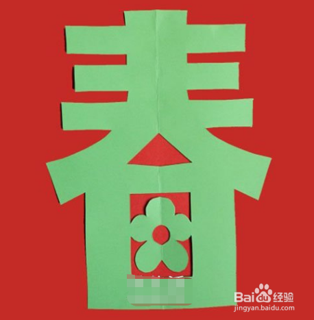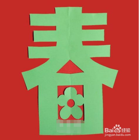 在春下边的“日”里面字上剪一朵小花,最后一步是在小花中间剪出一个圆孔。