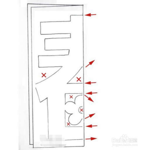 先把纵向对折一下,之后画出要剪的图案(春子的半边)。画好做好标记,实线要剪开,打叉的部分要挖去。接下来就开始剪了,从春字的上方开始剪,按图画剪到头,春字半边的就样子出来了。