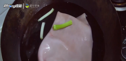 1将猪皮放入锅中,加入水、香葱和料酒。