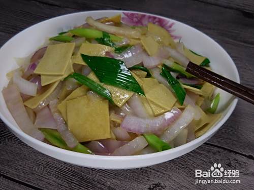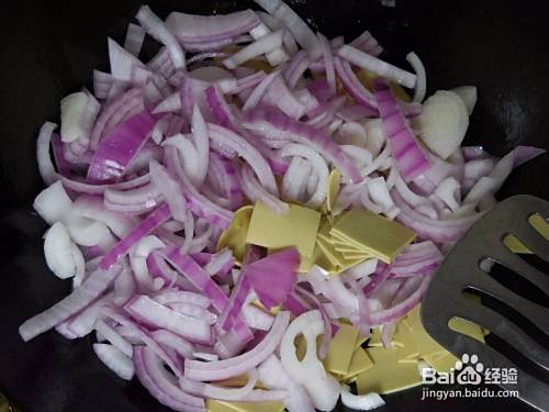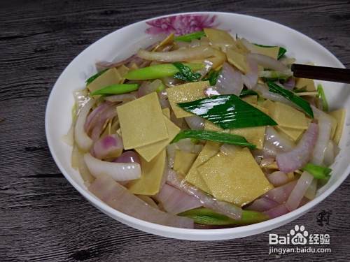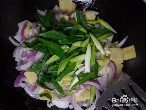 接着放入洋葱丝,和千张一起煸炒至八成熟。