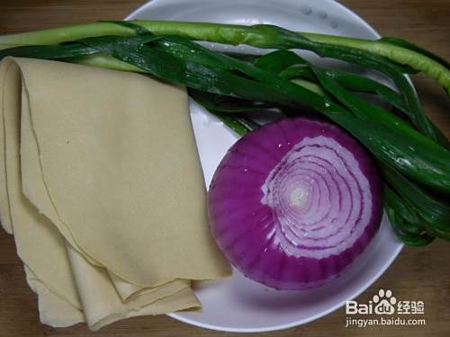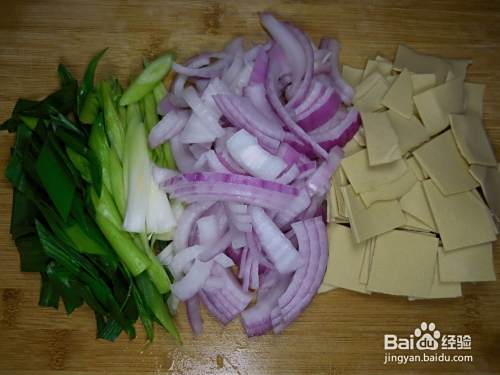 千张洗净后对折切成小方块,洋葱剥去外层切成丝,蒜苗切成段。