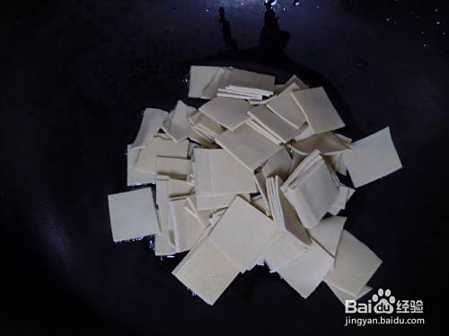 锅中倒上适量的花生油,开上文火下千张煸炒1分钟。