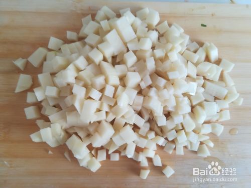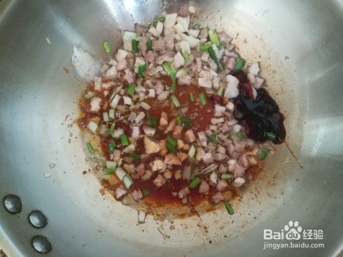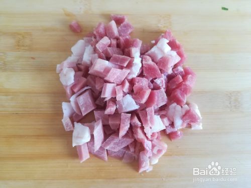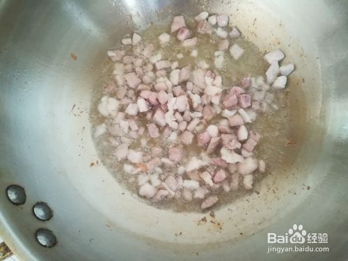 炒锅放花生油,等油五成熟时,把肉丁入锅炒至变色。