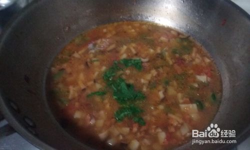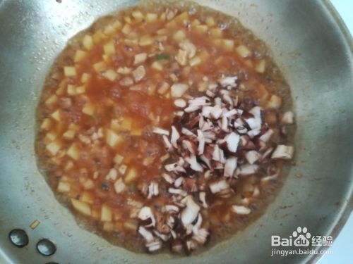 再把土豆丁入锅翻炒上色后,再加入适量清水熬煮。
