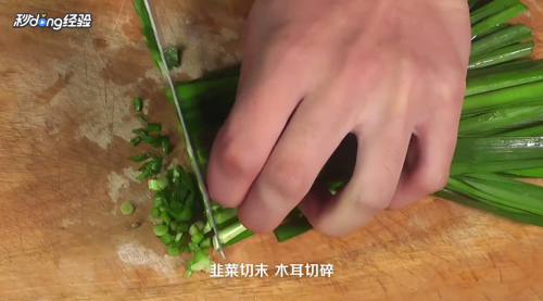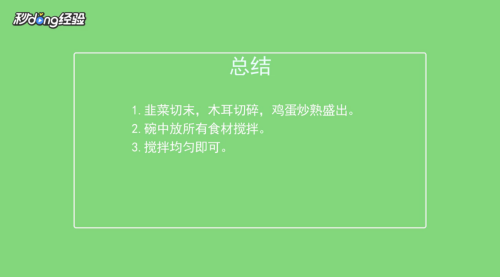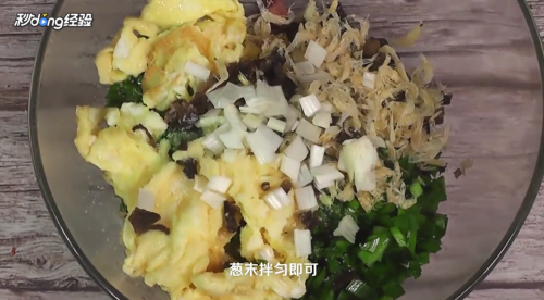 放入韭菜、鸡蛋、木耳、盐、虾皮、葱末搅拌均匀即可。