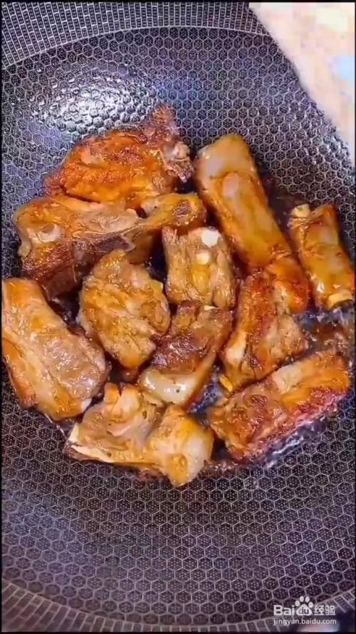 接下来起锅烧油,加入适量的冰糖炒糖色,炒出黄色后下入排骨,翻炒上色后,加入大蒜、葱、姜、八角、蚝油、红烧酱油,再加入开水,之后加入盐、鸡精、十三香再下入玉米。