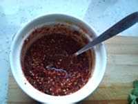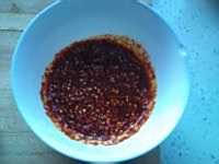 放辣椒油的容器里放适量辣椒面、白芝麻和花椒面