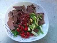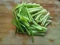 将牛肉码在芹菜上,撒上香葱和红尖椒