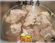 2用开水焯一下脊骨抛去血沫。高压锅里添水,放脊骨和几片姜片。不要放盐。大火压20分钟。