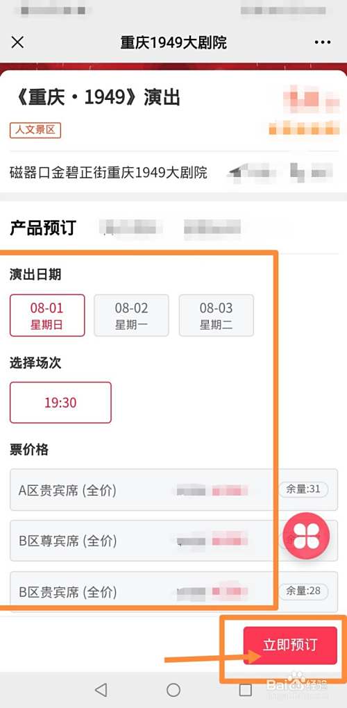 进入页面后,选择演出日期,场次,点击立即预订即可,如下图所示: