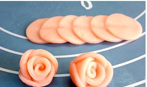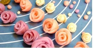 做成不同颜色、不同大小的花及叶片(叶片是将面团揉成水滴形、按扁、压出叶脉)