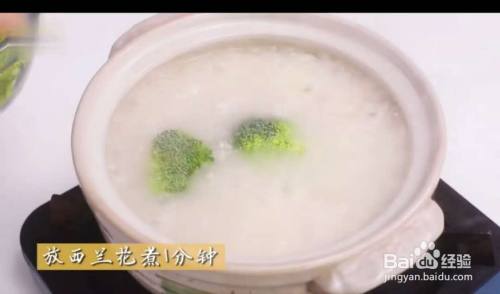 煮锅放入泡好的大米,倒入开水,小火煮到粘稠。然后放入鲍鱼片和虾段煮五分钟,然后放入适量盐和胡椒粉,搅拌均匀。再放入西蓝花煮一分钟,不断搅拌,看到浓稠之后就可关火了。