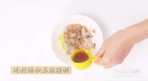 鲍鱼去除内脏,清洗干净,切片。放入料酒和姜丝腌制。