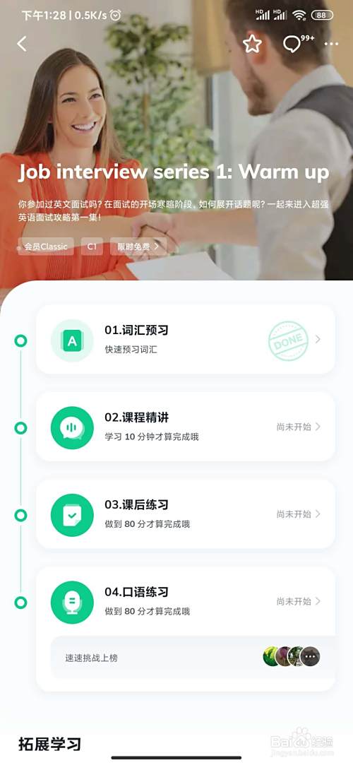 比如,我们先来看看“面试指导”板块。点击之后有很多类型供你选择。选择一项点击进去,学习计划已经被划分好了,有四个步骤: